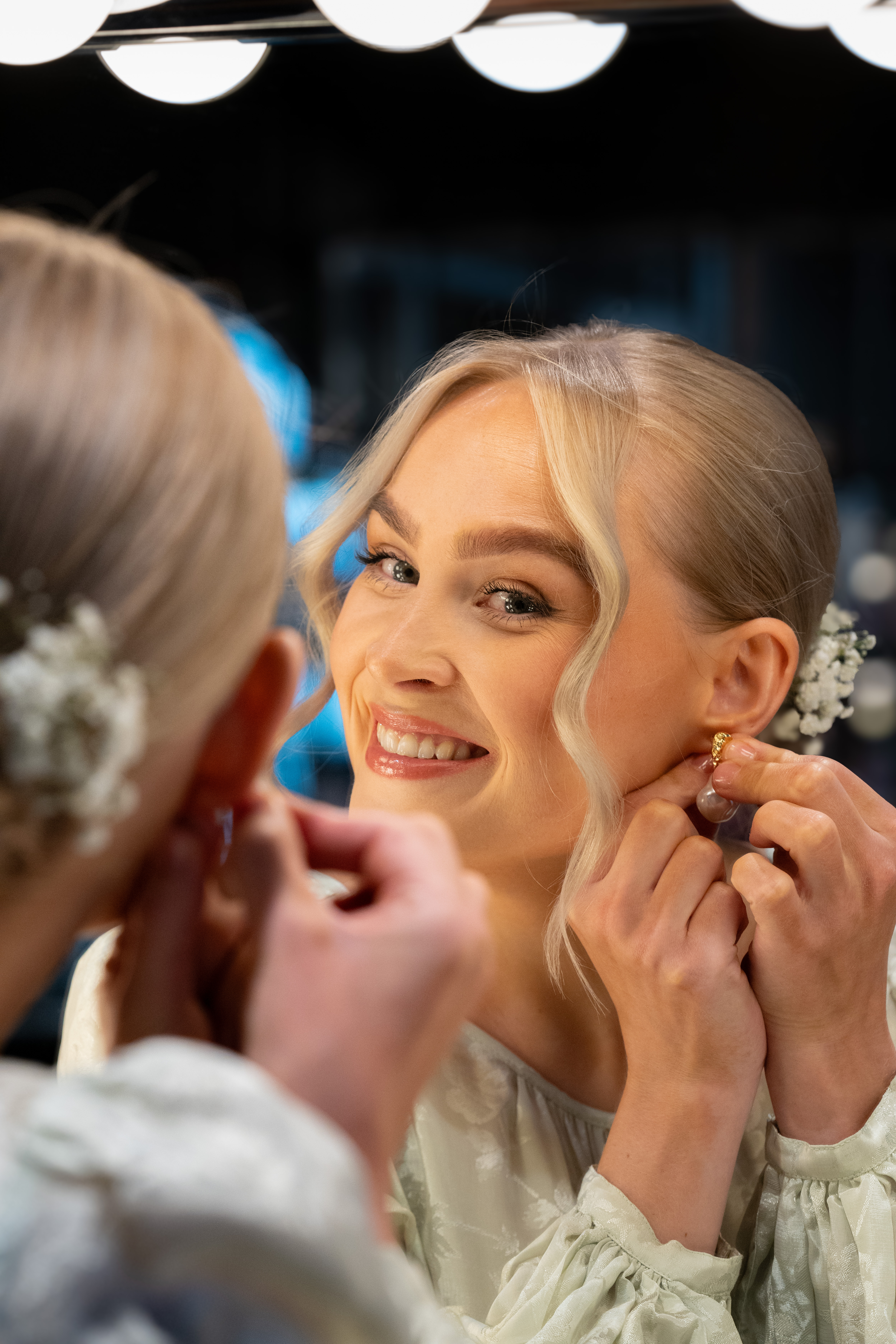 Forberedelser kan eksempelvis være at jeg møter på morgenen og fotograferer sminke, styling, påkledning og lignende. Vi avslutter med portretter etter vielsen. Brudeparet får 160 bilder ferdigbehandlet i farger og sort-hvitt.
