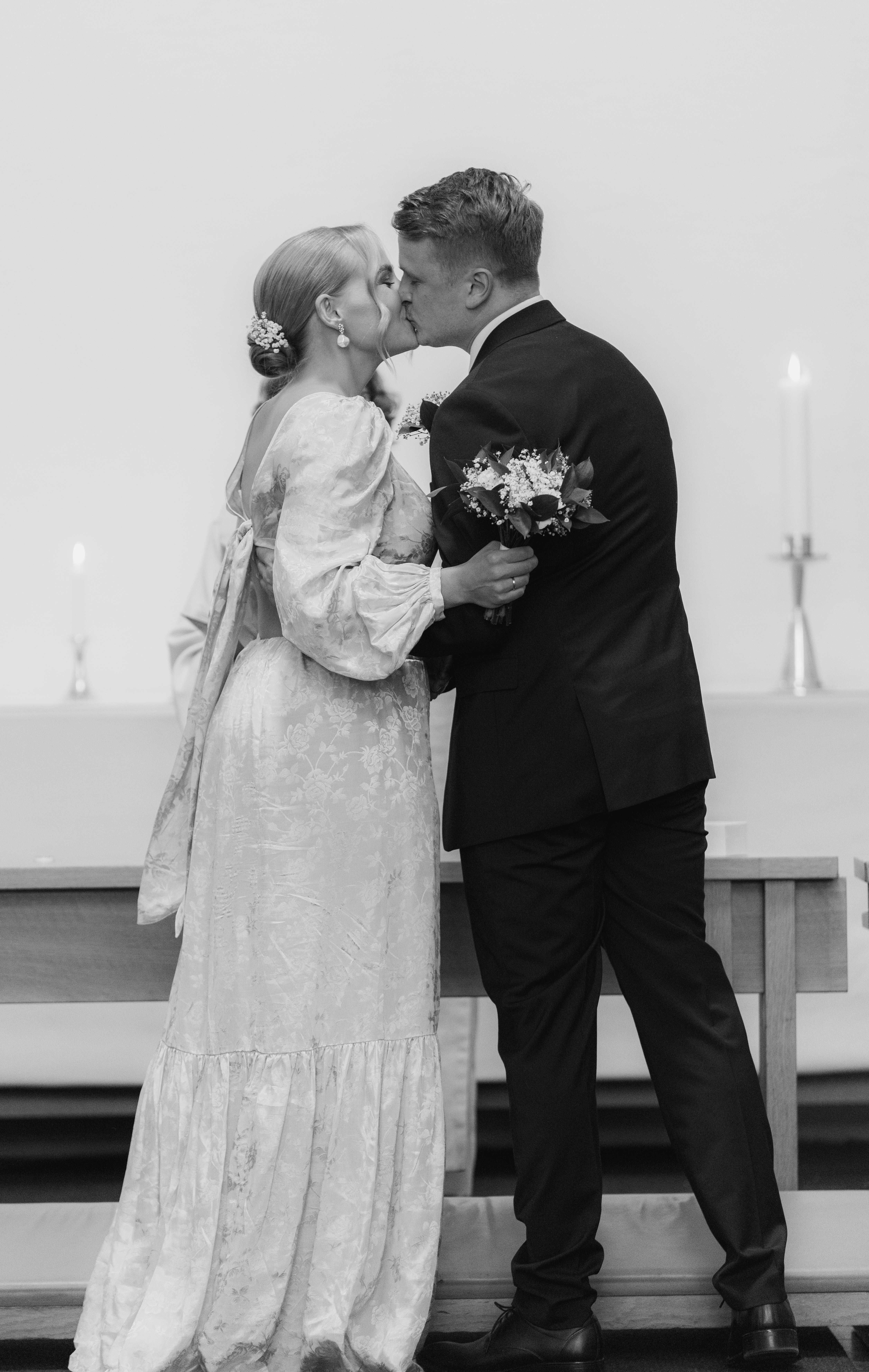 Dersom ønskelig kan portrettene gjøres i forkant av vielsen. Brudeparet får 110 bilder ferdigbehandlet i farger og sort-hvitt.